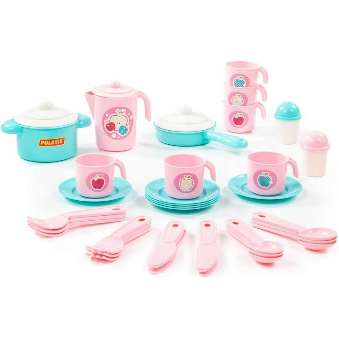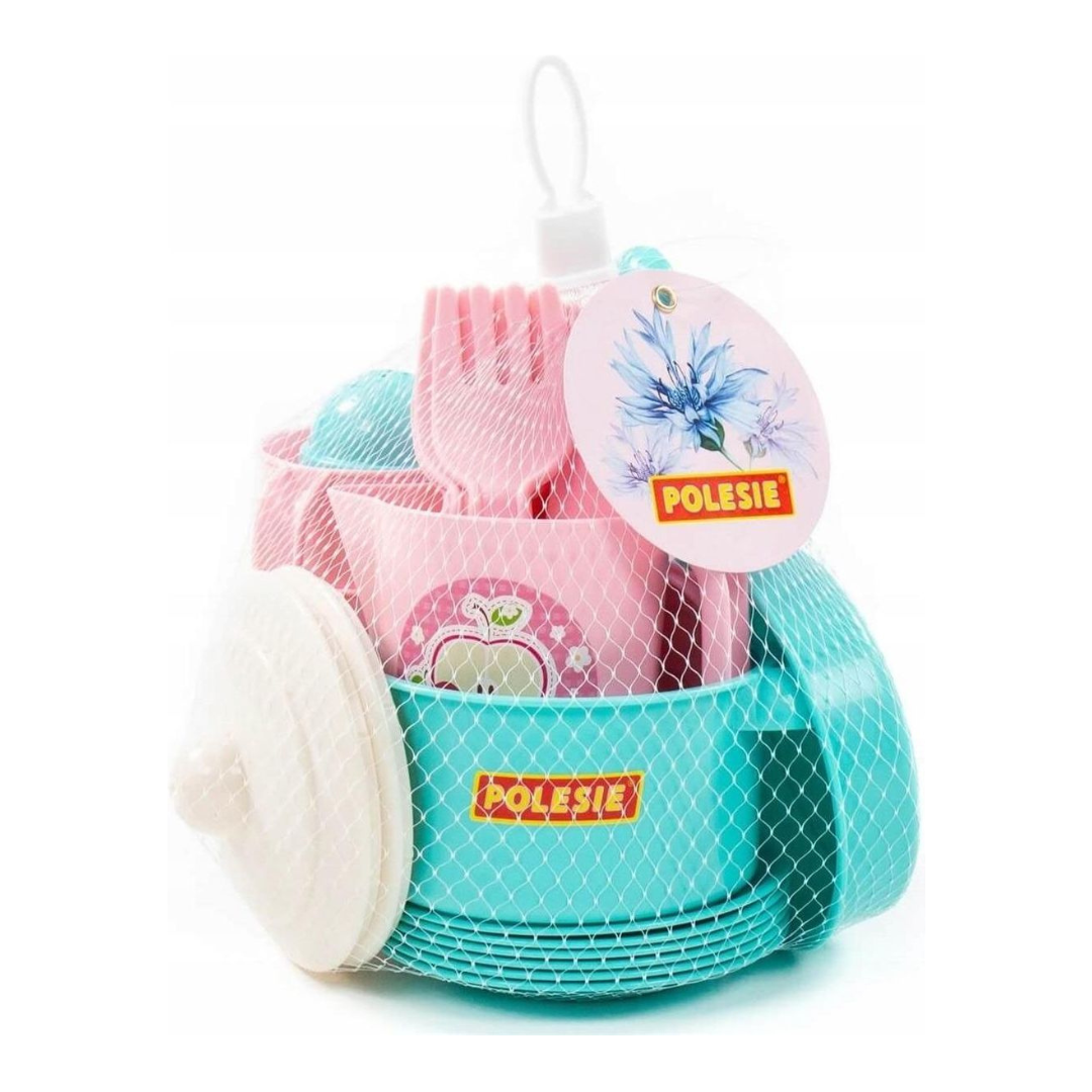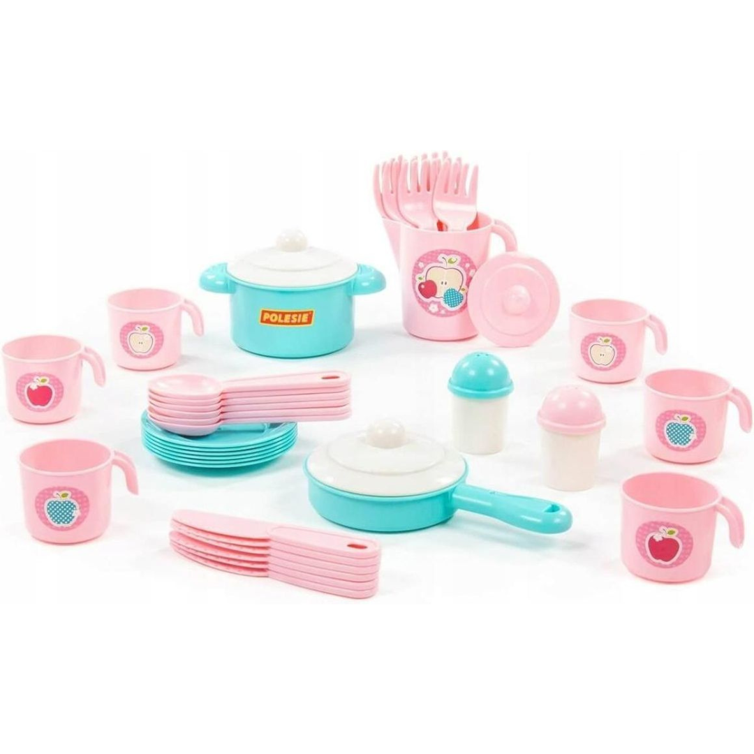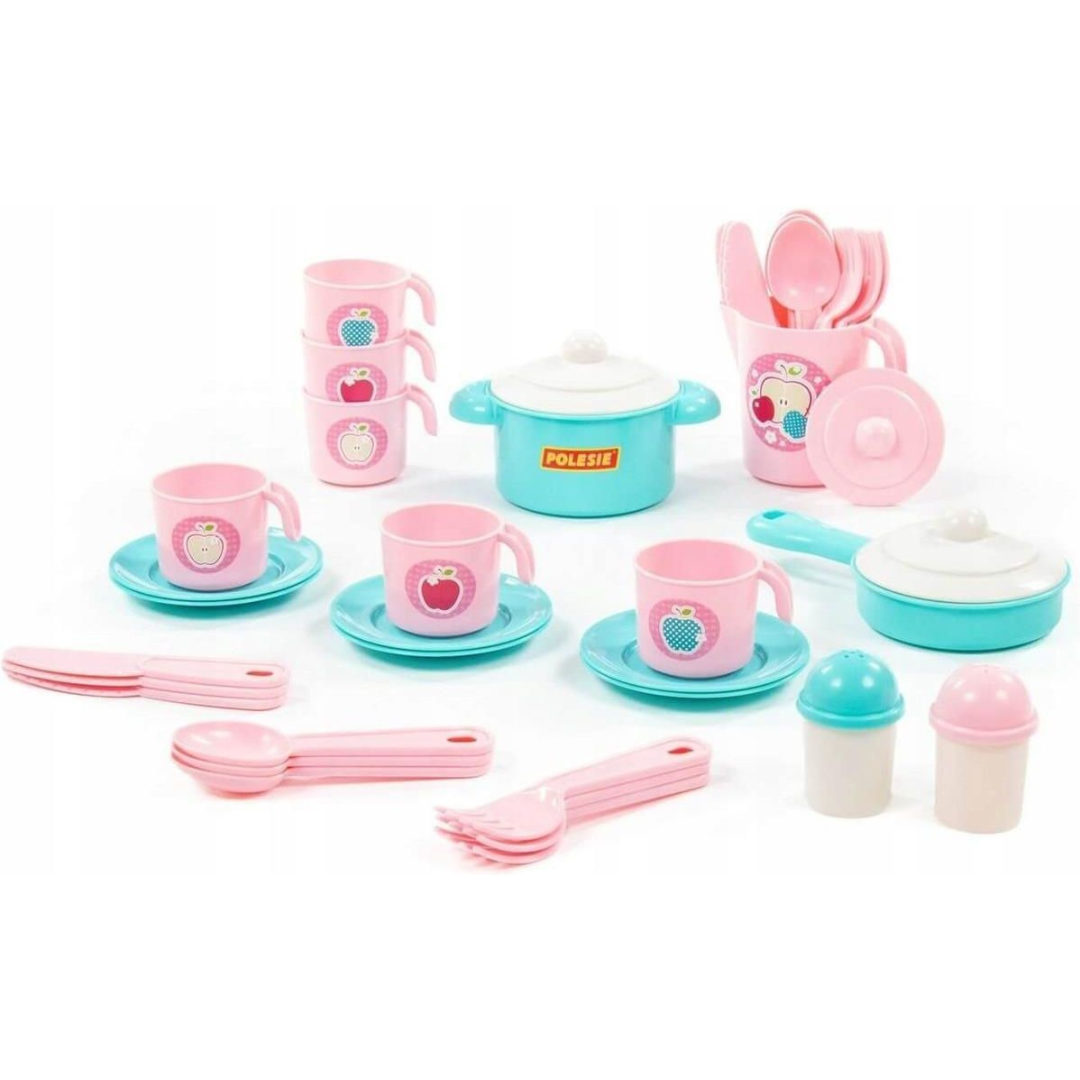 Trauku komplekts no 38 elementiem. Rozā komplekts un tirkīza trauki 6 personām. Komplektā iekļauts: krūzes, galda piederumi, katls un panna ar vākiem, 2 garšvielu trauki, šķīvji, dzēriena krūze.